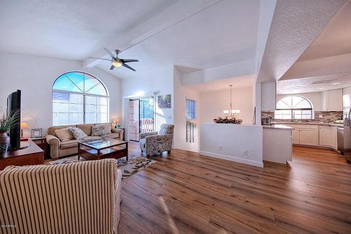 Exquisite 2/2 modern contemporary condo nestle superb location of Mesa Riverview. No detail has been left out of this stunning renovation that has created a beautiful synergy of both modern touches with classic/timeless materials to include: wide-plank oak wood-flooring vaulted ceilings dual pane [Low-E] vinyl windows white shaker cabinets new electrical w/ recessed & under cabinet lighting Frigidaire Gallery SS Appliances grey granite counters in kitchen white marble counters in bath(s) subway tile hall bath surround 12x24 textured tile in master bath surround with Carrera marble deco inlay classic 5 Panel doors with chrome hardware double sinks master bath chrome decorative delta fixtures in bath(s) to create timeless modern look great closet/storage space and beautiful upstairs large patio to enjoy meals outside in AZ winter months. Community offers 2 community pools and is perfect for all audiences seeking great location close to ASU & MCC mall(s) freeways Banner Hospital ball-parks etc.. Rent includes: water, sewage, & garbage.