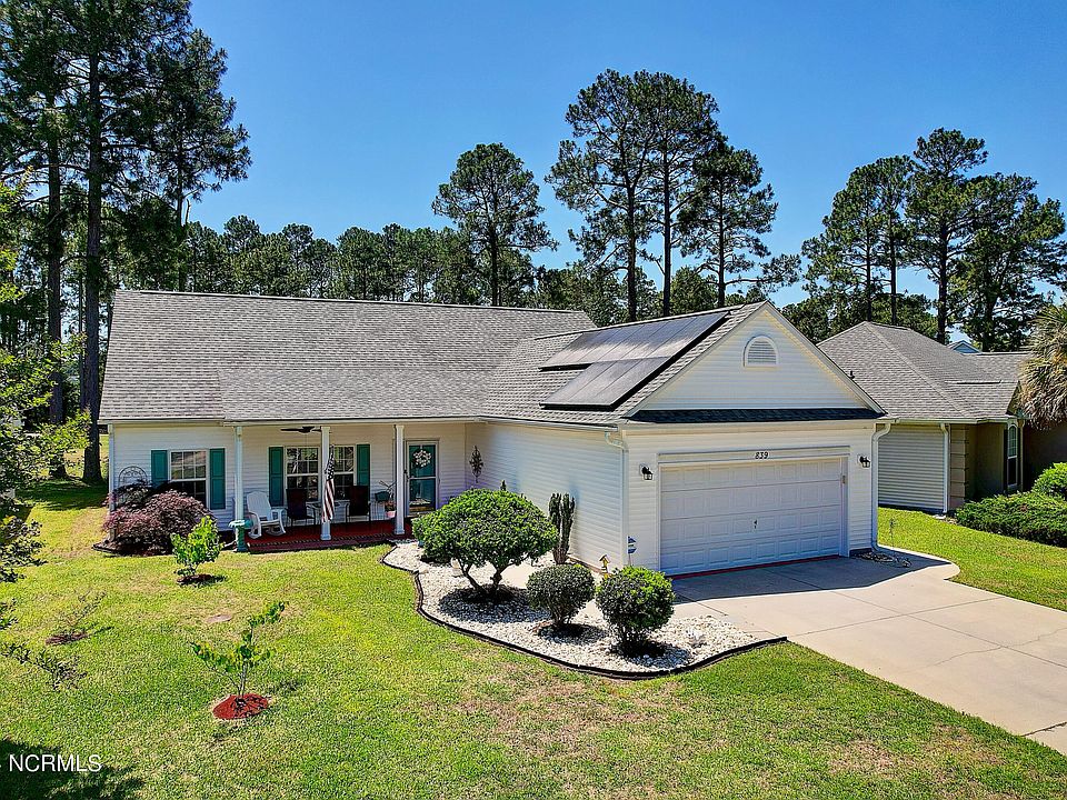 Ready to move in! Fall in love with this 3/2 home, with an oversized 2 car garage, beautifully mature landscaping in the desirable Sandpiper Bay Golf & Country Club Community. 27 Holes of Championship Golf designed by Dan Maples It's A Lifestyle -From Community Pools Tennis & Pickle Ball Courts, Fitness Center. Library, On-site Restaurant with a Beautiful Clubhouse. Upon entering the home. you are greeted by an open living area with Acacia Tobacco Rd engineered lumber flooring (30 yr. warranty), split floor plan with a dining doom and eat in kitchen. Lots of entertaining space. Bonus- there is lots of storage space, faucet in garage and Cape Fear Solar Panels. This home also features a covered lanai perfect for rainy days or beating the heat! It has additional 121 sq ft, sliding glass doors enclosed area to enjoy your golf view and fabulous wildlife. Only minutes from the beautiful Sunset Beach,