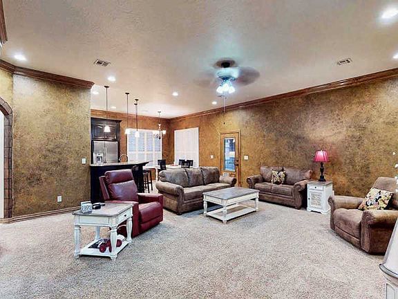 Beautiful 1.5 story 3BR 3BA brick/stone home located on a cul-de-sac, SW Ardmore. Wonderful floor plan with large, open living area. The kitchen bar helps delineate the kitchen from the living area and has enough seating for four. The kitchen features custom cabinets, granite counter tops, a double oven, and stainless steel appliances. The informal dining area is in the kitchen and overlooks the back yard. The formal dining area includes a closet to help store your seasonal entertaining items. The master suite is large and has a beautiful ceiling tray. The master bath includes a separate tub and a large walk-in shower. The large master closet features built-ins and floor-to-ceiling storage. The second bedroom has a bay window-type design and includes a large walk-in closet. The third bedroom and third bath is located upstairs. The bedroom is huge and has a recessed area with windows that overlook the back yard. It would be a great place for a reading/hobby area to take advantage of the natural lighting. The upstairs also has an area that could be a study area. A large insulated storage closet is accessed from this area. The utility room has cabinets and counter top areas on each side of the washer/dryer along with a hanging bar and a sink. Custom paint and beautiful woodwork throughout. There are Plantation shutters throughout the home on each window. The sun room is accessed from the living/dining area and is 150 sf with central heating and air. The covered patio is on the north side of the sun room. The garage has an in-ground storm cellar. The sprinkler system and the outside lighting are both on timers. The home also has a whole-house generator that is ran by natural gas. It automatically starts when the power goes out and is large enough to power the entire home. The addition has a private stocked pond; rights to use it on a catch-and-release system are included. A French drain is installed in the back yard and also drains the back gutters. Plainview schools.