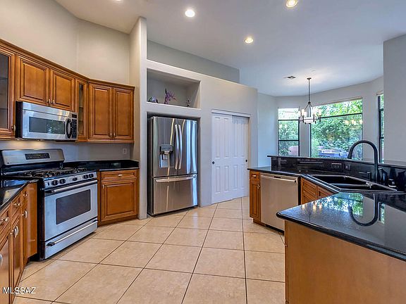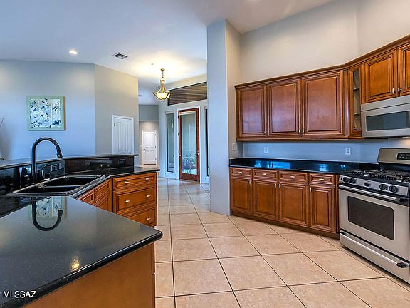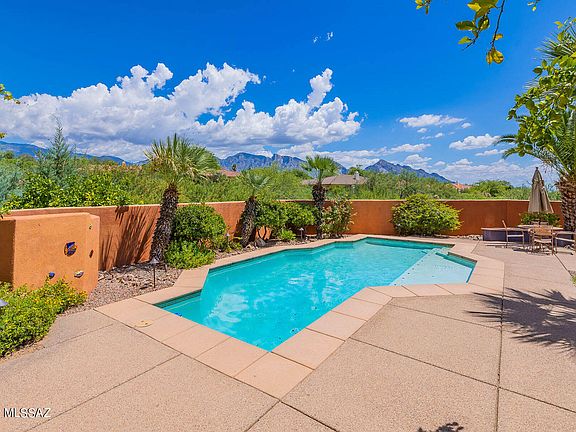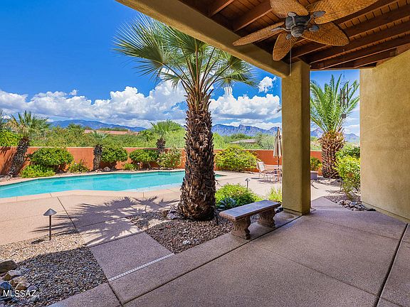 Spectacular 4BD/3.5BA (3,379 SF) estate on large cul-de-sac lot boasts a sparkling pool, owned solar and majestic Catalina views. Formal dining room overlooks front walkway w/fountain. Living room off atrium has built-in art/media wall. Open concept Great room hosts a Cantera stone fireplace, view windows and gourmet kitchen w/breakfast bar & nook, island, granite counters and stainless appliances. Private Owner's suite w/patio access adjoins den/office and hosts a luxury bath w/glass block shower & soaking tub. Amenities include guest room w/ en-suite bath, walk-in closets in all bedrooms, full hall bath, powder room. Extended 3-car garage has enclosed, air-cooled third bay. Resort-like yard boasts a covered patio, grill station, saltwater pool and colorful sunsets upon the Catalinas!