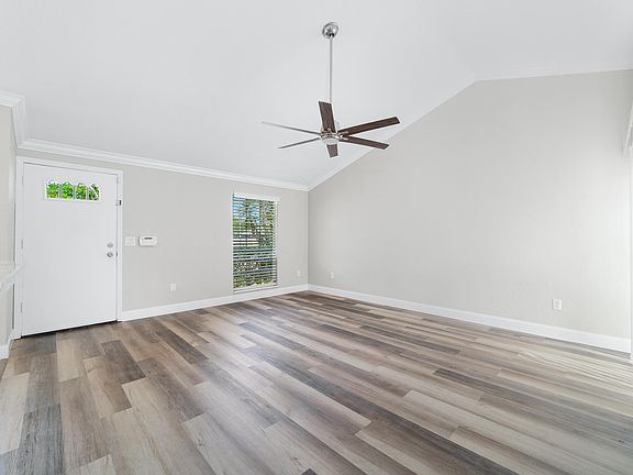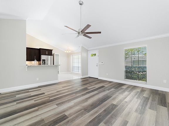 Stunning Move-In Ready Home with Modern Upgrades. This beautifully updated home offers brand-new flooring throughout, fresh paint, and updated landscaping, creating a bright and inviting atmosphere. The open-concept kitchen is a chef's delight, featuring cherry cabinetry, sleek granite countertops, stainless steel appliances, and elegant tile flooring. A spacious eat-in area with a large front-facing window floods the space with natural light, making it perfect for casual dining. Designed for comfort and functionality, this home boasts neutral tones, spacious closets in every room, blinds on all windows, and ceiling fans in all bedrooms. The modern, updated bathrooms add a touch of luxury, while a charming barn door leads to the dedicated storage and laundry area The garage has been expertly converted into a third bedroom, adding valuable living space. A New Impact Front Door will be installed in about 2 to 3 weeks. Additional updates include a brand-new water heater and a fully operational sprinkler system to keep the large fenced yard lush and green. The privacy hedge surrounding the patio creates the perfect setting for outdoor entertaining. Enjoy resort-style living with access to top-tier community amenities, including a sparkling pool, tennis courts, and more-all with exceptionally low HOA fees. This move-in-ready home is a must-see-schedule your showing today!
