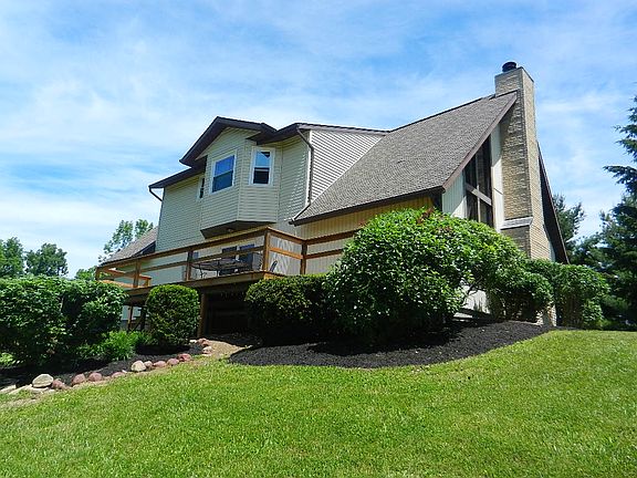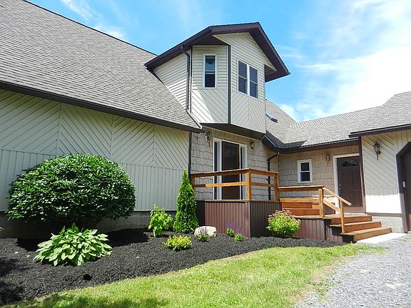 Stunning contemporary sitting pretty on 5 acres. Oversized 2 car garage measures 31' x 44' Special features include a combination great room/dining room that has beautiful exposed beam valuated ceilings and a cozy wood fireplace. A bright and sunny oak kitchen with ceramic counters, and breakfast bar. There are 2 bedrooms & 1 full bath on first floor. The second floor boasts a master bedroom suite, skylights, full bath, and alcove area currently being used as office but could be art studio/sewing room. There is even a large loft that overlooks great room.