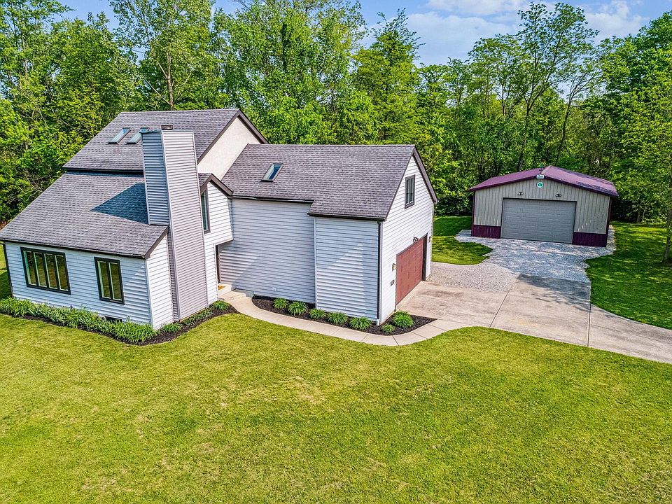 6.89 ACRES! One of the Seven Estate homes on this private drive off Riverside in Olentangy Schools. Soft contemporary home with vaulted ceilings in great room, and windows that frame the spectacular views. Open & spacious layout between kitchen, eating space, and dining room. First floor master has access to deck. Two bedrooms upstairs with huge 2nd floor bonus room with bar area. Screen porch off great room overlooks the mature trees. Unfinished full basement, back-up portable generator, tankless hot water heater, and battery back-up for sump pump. 30x32 detached POLE BARN (960 SQFT) will blow you away with 10' garage door opening. Rare opportunity to own acreage in Olentangy Schools.