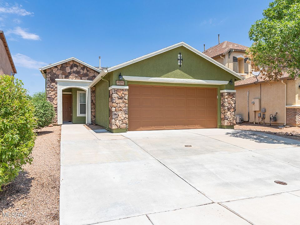 Range Price $274,000 - $284,000. 3-bedroom home in the peaceful Sonoran Ranch. It features a convenient 2-car garage and a striking facade adorned with stone accents. Inside, the inviting living room sets a warm tone with its neutral color palette and tile flooring. Well-appointed kitchen is a cook's delight, equipped with stainless steel appliances, granite counters, wood cabinets, and an island with a breakfast bar. Additionally, a serving window opens to the living room, perfect for entertaining guests. The spacious main bedroom is a true retreat, complete with a walk-in closet and a private bathroom that boasts dual sinks and a soaking tub. Outside, the serene backyard offers a covered patio and ample space for enjoyable barbecues. Don't miss the opportunity to call this lovely house