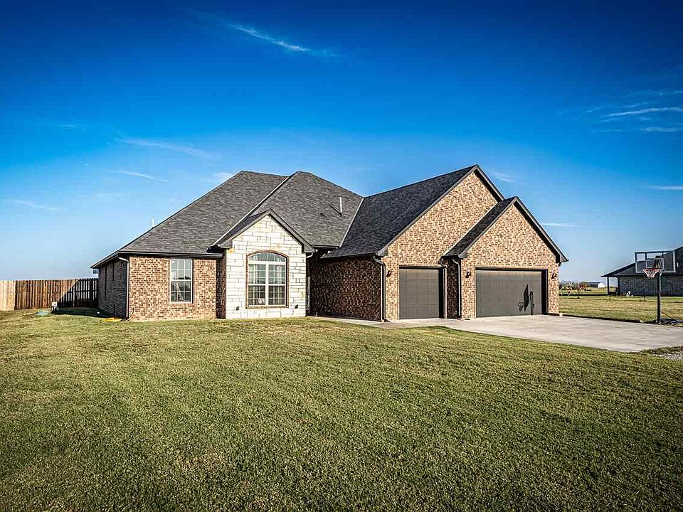This beautifully designed home features an open, mother-in-law floor plan, and sits on 3+/- acres. You'll find it configured with either 4 spacious bedrooms or 3 bedrooms plus a dedicated office with 2 full bathrooms. Indulge your inner chef in the country kitchen, complete with a generous island and breakfast bar, abundant counter and storage space. This includes a sleek slide-in range and a convenient single wall oven, ideal for all your holiday culinary endeavors. The living room is a true highlight, boasting a cozy ventless gas fireplace, soaring 10-foot ceilings, and oversized windows that look over the massive backyard. The above ground safe room is located on the back patio. This property has a 3 car garage with access to a floored attic perfect for stowing away holiday decorations. There is ample outdoor space for RV parking, hot tub on the back patio, and above ground pool in the backyard. Call Laira at Real Estate Experts for your private tour... 580-248-2600.