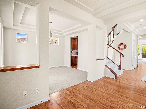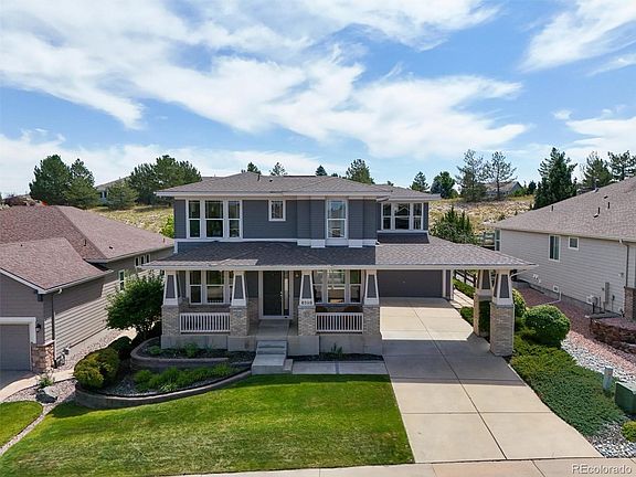 Welcome home to Winter Berry Drive, a meticulously maintained 2-story home in Castle Pines North boasting modern craftsman architecture and over 3,000 square feet of finished living space. A beautiful covered front porch and a porte-cochere (which leads to a tandem 3-car garage), add great curb appeal to this smartly designed property. Stunning hardwood floors, coffered ceilings, architectural details, and a neutral palette unfold to both formal living and dining spaces, ideal for entertaining. A grand 2-story family room with a dual-sided fireplace and abundant light invites the outdoors in. The eat-in kitchen features an oversized center island, ample 42’ cabinetry, a gas range, and a butler’s pantry. Step out the large glass slider to a huge deck overlooking a private yard backing to open space. Retreat to your spacious primary suite including a large walk-in closet and 5-piece ensuite bath. The light-filled second floor features a Juliet balcony in the bonus loft space, a catwalk to two secondary bedrooms with ensuite baths, and a large laundry room with built-in cabinetry, counter space, and a utility sink. Additional features of this turn-key home include a main floor office with a fireplace, a plumbed unfinished basement, and a secondary entry with a wood deck by the tandem garage. Castle Pines North offers many resort-style amenities including trails, a community pool, a park, tennis and basketball courts. Ideally located within minutes of Daniels Park, Castle Pines Golf Club, and the Ridge at Castle Pines North, along with Douglas County schools, shopping, dining, and more, this property is truly a prize find in the heart of Castle Pines North.
