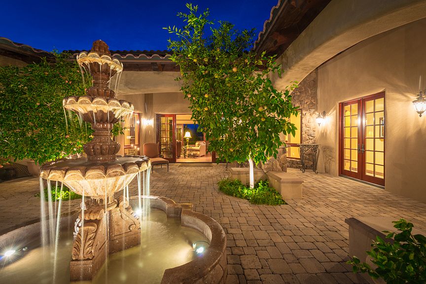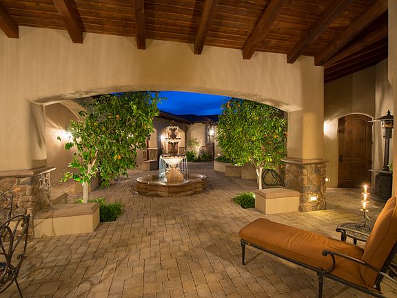 THIS IS TRULY A HIDDEN JEWEL W/EXQUISITE DESIGN & CRAFTSMANSHIP...Situated on 1.16 acres of privacy & serenity, this luxury Santa Barbara/Mediterranean home located in North Scottsdale offers the ultimate in Craftsmanship & Energy Efficient Elements. You will be mesmerized with the 20 ft. vaulted Tongue & Groove ceiling with massive wood beam Trusses and Corbels. A large scale Canterra Stone fireplace & wrap-around Hearth. The split floor plan offers flexibility & versatility to accommodate many different lifestyles. 4 bedrooms, + Office, Music, & Exercise Rooms, 5-car garages (3 are temperature controlled), Gourmet Kitchen including Dacor Gas 6-burner SS Cooktop, Granite countertops w/Ogee edge, oversized island. City Light View(s), Cul-De-Sac Lot, Mountain View(s), North/South Exposure, Citrus Courtyard.