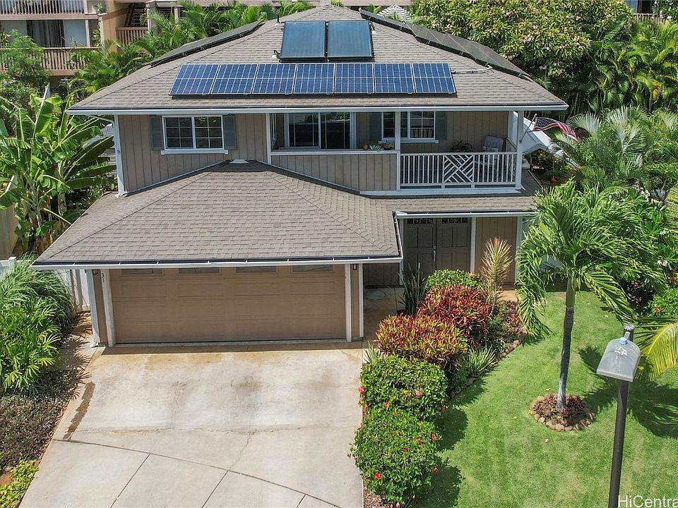 Welcome to the gated community of Makaha Oceanview Estates! The gorgeous ocean and Makaha valley range can be seen from this large 2,118 sqft., 4 bedroom/2.5 bath home. The en suite bedroom is located on the 1st floor. The Seller spared no expense and added $27k worth of beautiful tropical landscaping to the 5,516 sq ft property, including your very own apple banana and a mango tree! Come home and relax in your own jacuzzi or take a dip in your above ground swimming pool after a long day at work. Feel the cool breeze on your covered patio, with your favorite beverage in hand. This home is ready for you with 39 leased Photovoltaic Panels that is transferable! The Seller proudly served our country and has a great VA ASSUMABLE LOAN @ 2.75% to offer to a qualified VA Buyer. Come now and enjoy the beauty of Makaha Ocean View Estates.