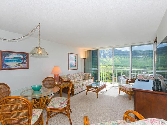 Pristine, beautifully maintained 10th floor unit in desirable Makaha Valley Towers, with its resort-style living and spacious units. Floor to ceiling sliding doors show off the spectacular million-dollar views, and this desirable model has the living room facing the ocean. Pretty design touches and colors make for a lovely living space. Central AC keeps you cool year around. All furniture included! Island furniture, lamps, linens, silverware and accessories invite you home to the tropics. Just drop your suitcases and go. Great location near elevator and laundry area. Maintenance fees include everything--Electricity, AC, water, sewer, trash and basic cable. Amenities include BBQ and picnic areas, heated pool, lounge chairs, 24X7 security, on-site management office.