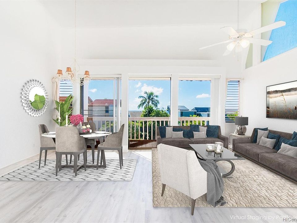 One of the West sides best kept secrets, Makaha Valley Plantation is a beautifully maintained & landscaped gated community. Prime top floor, preferred corner-end unit with vaulted ceilings & high gable window for maximum light & sunshine. Breathtaking ocean, lush mountain & garden views! New vinyl plank flooring throughout. Two full parking stalls at front of the building directly below the condo. Plenty of guest parking. Resort-like amenities- 2 pools, jacuzzi, tennis court, multiple BBQ areas, terrific 24/7 security & is located just up the hill from world famous Makaha Beach & lovely hiking trails. Pet policy: combination 2 pets with combined weight of not more than 75 lbs. (please verify). Rare hook up for washer dryer. Virtually enhanced images to show how it could look furnished.