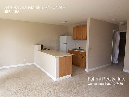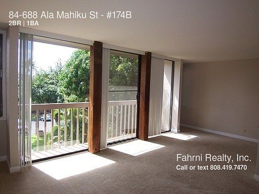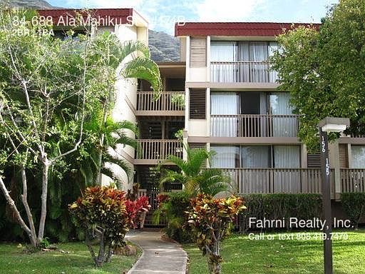 SCHEDULE A SHOWING ONLINE AT: showmojo.com/lh/11d285b0b9 MONTH TO MONTH RENTAL (NO LONG TERM LEASE) Newer Carpet and Recently Painted 2 bedroom 1 bath. 2nd floor unit with lanai. Full Kitchen. Partly Furnished. Makaha Valley plantation amenities include gated community with guard shack, 24 hour security, 2 swimming pools 2 Jacuzzi's /spas .BBQ grills Tennis court basketball court. Less than 10 minutes to the white sands of Makaha beach. Enjoy Kamaaina Living. MONTH TO MONTH LEASE ONLY. No Pets Non Smoking. APPLY ON LINE AT WWW.FAHRNIREALTYHAWAII.COM www.fahrnirealtyhawaii.com FAHRNI REALTY, INC 808-486-4166 MONTH TO MONTH RENTAL ONLY