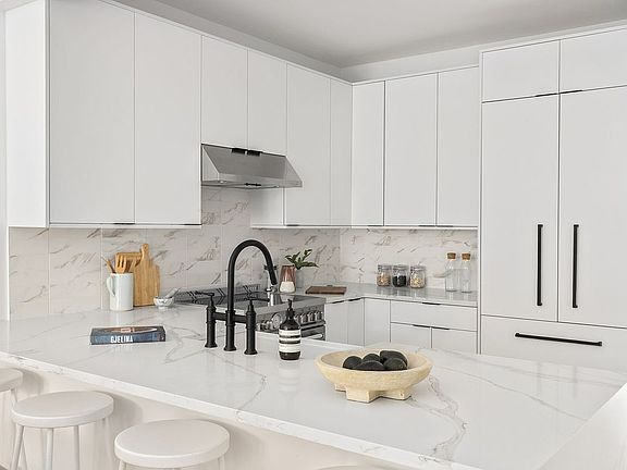 Residence No. 2 is a two-bedroom, two-bathroom full-floor unit with home office. All residences at 84th Avenue have expansive, open-plan living rooms ideal for real entertaining, which measure over 30’ from the kitchen to front windows. The primary bedroom is huge and can accommodate a king size bed, and features an oversized closet. The ensuite bathroom has floor-to-ceiling statuary marble with brushed nickel fixtures. The secondary bedroom can accommodate a queen size bed, and the secondary bath features Gramercy tile and polished nickel fixtures. The kitchens are all U-shaped with honed Quartz marble waterfall counters, an integrated Bertazzoni fridge with dual freezer drawers, Bertazzoni dishwasher, and 30” induction Bertazzoni induction ranges. The master bath features floor-to-ceiling statuary marble with brushed nickel fixtures, while the secondary bath has Gramercy tile and polished nickel fixtures as well.