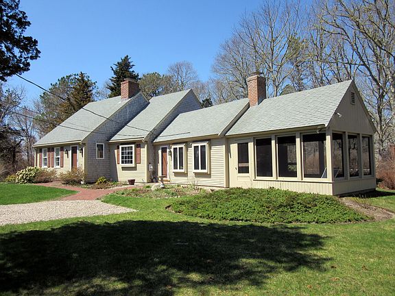 Located less than a mile from spectacular Nauset Beach, this 3 bedroom, 2 bath Cape offers the ambiance of casual country living. As you enter, your eye is drawn upward to a soaring tongue and groove pine ceiling. Accenting the dining area is a floor-to-ceiling brick fireplace that houses a Jotul wood stove. The sky-lit kitchen features tile flooring, solid surface counters & a breakfast bar. Off the dining area is a living room with beamed cathedral ceiling, another fireplace and doors leading out to a screened porch. Two good-sized bedrooms & a full bath complete the 1st level. Upstairs is a bright front-to-back master bedroom with private bath. Bonus space in the finished lower level could be a media room or home gym. Set on a private 1.19 acre lot, this home is expandable to 4 bedrooms.