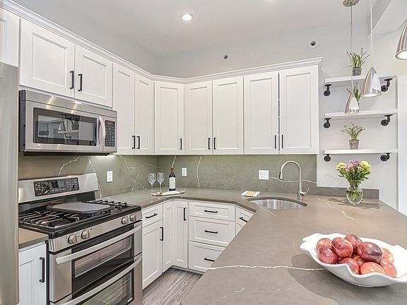 EXCEPTIONAL! Move right into this completely renovated, bright and spacious 2 BR top floor unit. Tastefully designed kitchen offers custom white cabinetry, quartz countertops with a peninsula that's perfect for entertaining, gas cooking, stainless appliances, and abundant storage. Renovated bathroom with classic marble subway tiles includes wall mounted TV to enjoy while soaking in the deep jacuzzi tub. Spacious living room has fireplace and hidden storage. Other amenities include full size washer/dryer, hardwood floors throughout, central air, custom blackout shades in bedrooms, private deck, private storage in basement, deeded and assigned parking, and direct rear entrance. Great location close to parks, restaurants, bus line and T station. This property is not to be missed!