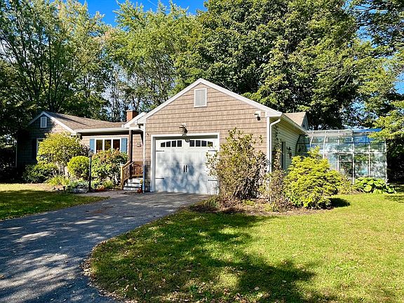 Welcome to this well-built, south-facing 2-bedroom,1.5-bath ranch on a quiet street in desirable Hatfield. Situated on a flat .9 acre lot, this home offers peaceful views of open field from the back porch. With a layout for single-level living, the open-concept kitchen, dining area, and living room flow to the porch through sliding glass doors. The sun drenched addition offers flexibility for a family room, home office, or even a third bedroom appointed with 2 sets of wooden pocket doors. Oak floors throughout all but kitchen and bathrooms. Ample closet space in bedrooms, entry and hallways. Convenient 1st floor laundry. Oversized single-car garage leads to sprawling, dry, high ceilinged basement with shop area, a separate empty room and tons of storage. Outdoors enjoy a generous covered porch, a greenhouse made of metal and glass, two patio spaces, one with a fire pit, a small pond with running water potential, and a good sized garden shed. Minutes from Northampton, shopping, & Rt 91