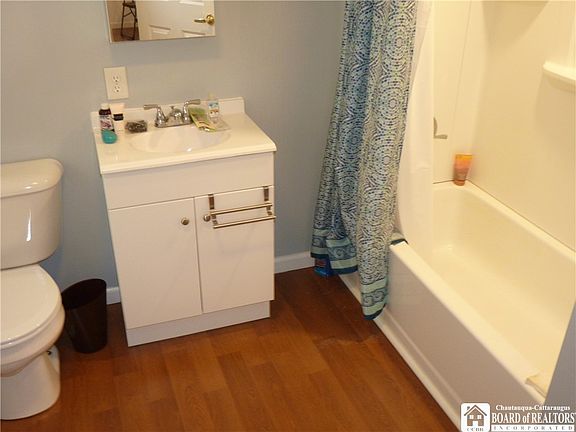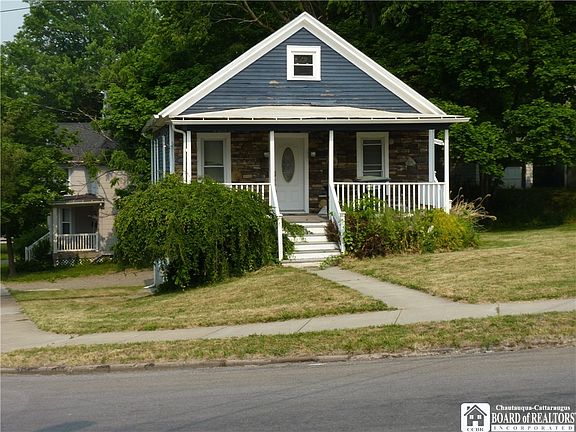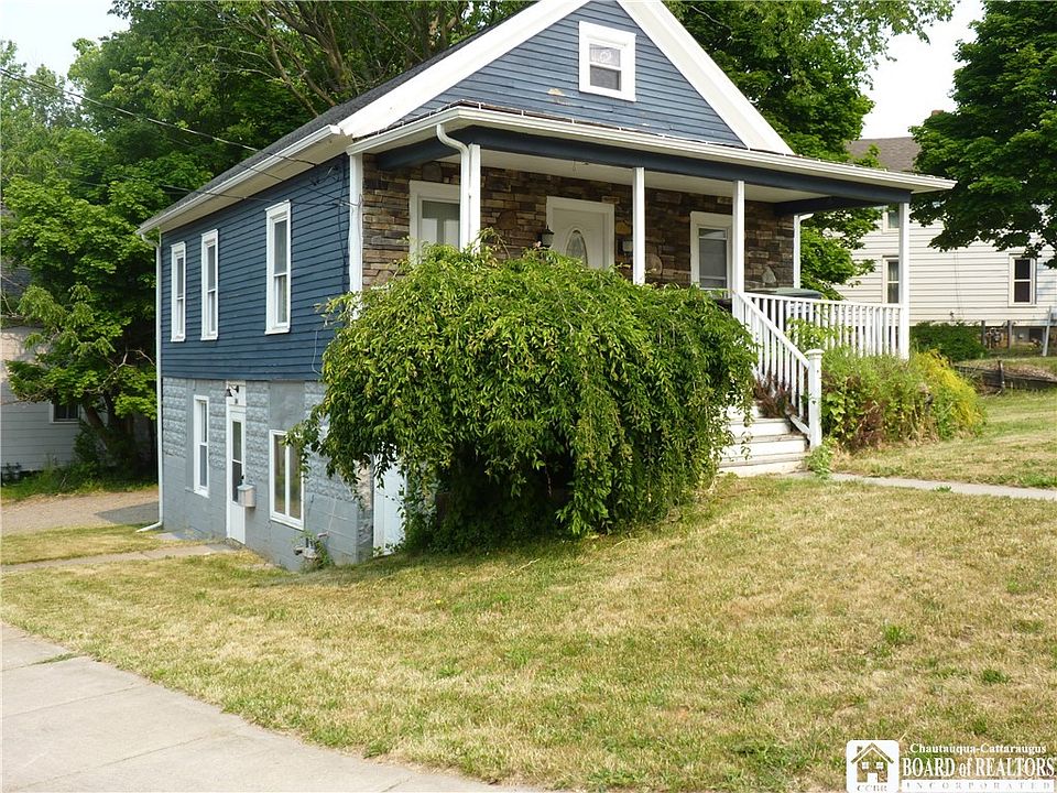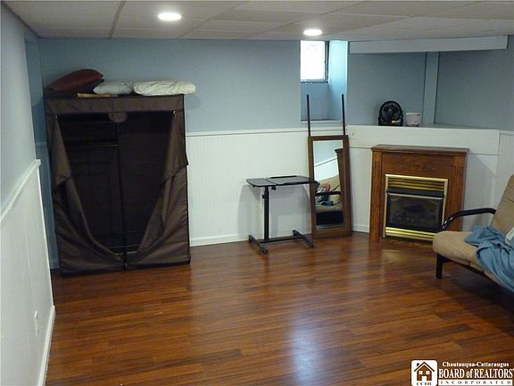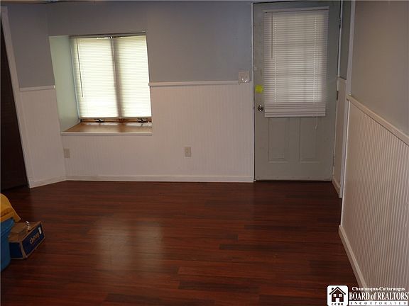 Well maintained 2 bedroom, 2 full bath home on a corner location in the village of Fredonia. The front of the home has a large porch with keypad front entry door that enters into a combination living/kitchen area with newer floor. This floor has 2 bedrooms; one in the front and one in the rear. In the kitchen there is a 3 stool eating area, large sink with counter space, gas stove and refrigerator along with a walk in pantry. There is a large full bathroom off the kitchen, in addition to the hallway to an enclosed side porch area and doorway to the open attic area along with a stair way to the lower level of the home. At the bottom of the stairway is a laundry room with sink, furnace and hot water tank. Beyond this, is a large open room with fireplace, laminate flooring, a side entry door to the street level and a large full bathroom. There is carpeting, tile, laminate/hardwood floors and wainscoting throughout the home. Additional storage is available under the front porch area. Property contains off street parking with a one car driveway on Prospect Street. This home has many possibilities.