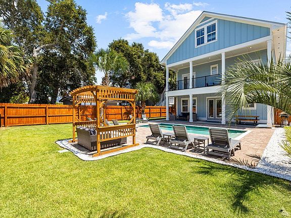 Experience this modern beach home, perfectly situated in the heart of Crystal Beach, just steps away from two public beach accesses. This stunning retreat, crafted with care and attention to detail, was completed in April 2018 and features professional decor throughout. With a total of seven bedrooms, each accompanied by its own full bath, it ensures maximum comfort and privacy. Spanning just over 3,300 square feet, this expansive residence offers abundant space for gatherings and relaxation. The main floor is designed for convenience and socializing, showcasing a fully equipped kitchen, an inviting open living room perfect for entertaining, and two luxurious king bedrooms. Ascend to the second floor, where you'll discover four additional king rooms, each with its own private balcony. This level also includes a spacious living area featuring a queen sleeper sofa, making it a versatile space. Venture outside to the generous backyard, which features a private heated pool that invites leisurely swims or sun-soaked lounging. For the culinary enthusiast, a gas grill is readily available for enjoyable outdoor cooking, allowing you to savor your meals in the fresh air. The outdoor shower provides a convenient option for rinsing off after a day at the beach, while the shaded sitting area, furnished with umbrellas and ample loungers, creates a perfect haven for relaxation. The property also boasts an oversized driveway, accommodating up to seven vehicles, with additional space available for a boat or RV, ensuring your adventures are just a step away.