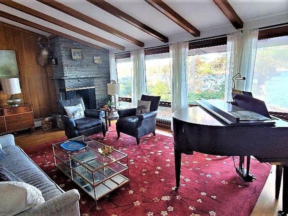 Waterfront L-shaped mid-century style elongated ranch with panoramic 200 degree easterly, northern and southern water views overlooking Slacks Pond on the Johnston-Smithfield line. Features include entry foyer, open concept kitchen, fireplaced living/dining area with beamed vaulted ceilings, floor to ceiling/window walls overlooking pond and grounds, 3 spacious bedrooms with walls of closets, hardwoods throughout and 2 full baths on main level plus full walkout lower with more water views, home office, gym/additional quest bedroom and full bath in addition to the recreation/game room, laundry room, storage and utility rooms. Enjoy the convenience of the attached oversized 2 car garage. Set perfectly on nearly an acre this year round vacation setting with gently sloping private yard in convenient Greenville is centrally located just 5 mins to I295 and 20 mins toI95/495 and downtown Providence. Tenant pays for lawn maintenance and snow removal