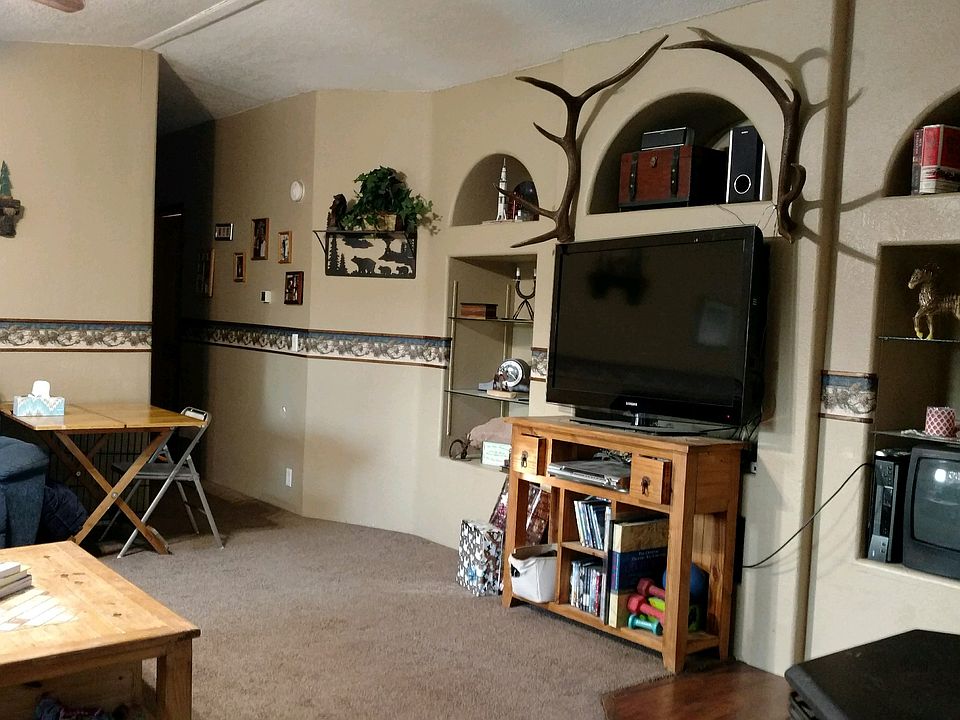 Vernon, AZ (17 mi from Show Low AZ) Horsse property, tack shed + 2 sheds, large (650 sq ft) deck, pull thru drive, cedar & juniper trees, HOME: 1700 sq ft, vaulted ceilings, laminate-ceramic-carpet floors, LR built in display & entertainment shelving, large MBR bath, kitchen island, laundry room, pellet stove,