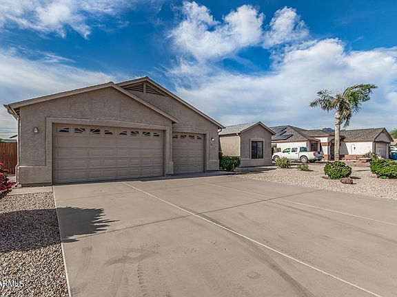 Don't miss out on this charming single-level home waiting for you in a non-HOA community! Providing 3 beds, 2 baths, an above average sized 3-car garage w/ 10 ft ceilings w/ 3 additional storage closets inside plus a utility sink, large lot being just over 10k, RV gate & RV parking for those toys, & low-maintenance professional landscape. Come inside to find a desirable open layout, making entertaining or gatherings a bliss! The kitchen boasts SS appliances, solid-surface counters, a pantry, recessed lighting, ample wood cabinetry, and an angled island w/breakfast bar. Natural light filled the spaces, complemented by a neutral palette and tile flooring w/soft carpet in all the right places. Large primary bedroom has 2 walk-in closets and an ensuite with a separate tub/shower. Check out the spacious backyard, offering a covered patio to relax or enjoy BBQ! Also including two storage sheds with window-units & electric installed, ensuring tools are organized and more. Conveniently located near the Hwy 60! Being in a non-HOA provides you the opportunity for short term rentals. Don't forget how close you are to a short drive to the AZ lakes and river for those that love the outdoor lifestyle. You will love the Arizona mountain views/sunset you get in this area!
