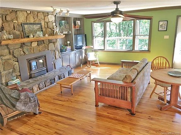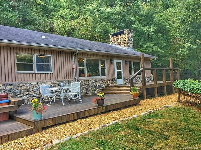 One of a kind scenic view of Pisgah Mountain from this Haywood county home in the Cruso community - private forest setting in close proximity to Springdale Country Club, Waynesville, and the Blue Ridge Parkway. This approx. 2350 sq. ft. single-story house contains 3 bedrooms, 2 spacious living-areas, 2.5 baths, and 2+ car garage, open-floor plan, large windows, and relaxing feel. Wood & tile floors throughout, cozy stone fireplace, & spacious kitchen with a custom walk-in pantry, plus a 600 sq. ft. deck. Property is approximately 4 acres and contains an established garden area, berry stands, lots of mature trees, and a small creek with approx. 130' of pond edge along the front boundary. Property has private deeded access, and mostly paved driveway - off a very quiet dead-end lane. Amazing location conveniently located between many of WNC's great attractions! always enjoys clean mountain air from the Forest.