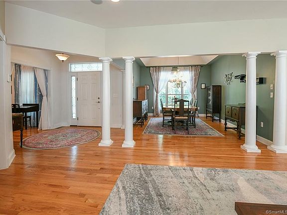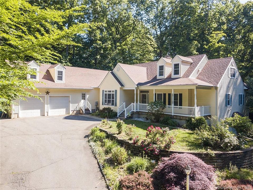 Cul-de-sac, 3 bedroom, 3.1 baths, expanded cape that lives like a ranch! Open floor plan, 9 ft. ceilings and hardwood flooring throughout. The mahogany, covered front deck welcomes you into the large great room with stone fireplace, The adjoining dining room has a 12-ft tray ceiling, architectural columns, and light-filled, oversized window. The living room with gas fireplace makes a great 1st floor office. Expansive, eat-in kitchen delights with red birch cabinetry, center island, and eating area with backyard views. Mudroom area off the kitchen houses the laundry room, half bath, and separate entrances to the garage and driveway. All bedrooms are on the main floor. The private, primary bedroom has its own full bathroom with walk-in shower, dual vanities, and updated walk-in closets. The other two bedrooms share a Jack-and-Jill bathroom. Additional full bath with whirlpool tub on first floor. Floored, walkup attic with dormers and walkout basement with 9 ft ceiling offer an abundance of future expansion space. 3-Zone heating and cooling. Central Air. 1500 gallon septic tank.