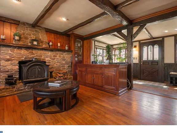 Own something truly special in this 3 BR home marrying classic elegance with European charm on a spacious double lot. With unique finishes and custom details throughout, every room is a delight. Step into the striking foyer where warm wood, slate and stone welcome you home to your escape from the ordinary. The Living Room features a wood-burning stove nestled in a floor-to-ceiling stone fireplace, with rich built-in cabinetry on either side for displaying your treasures. The solid wood floors and slender wooden beams throughout guide you into the heart of the home - a dining area defined by brick-lined pillars separating the formal living space from the useful and functioning parts of the home. Here, more custom wood cabinetry with leaded glass panes serves as storage for your linen, china and crystal. As you move beyond the formal living space, a full Kitchen and Utility Room directly off the Dining Room make entertaining and housekeeping easy. There is a full Bath, with recent updates, and three comfortably-sized Bedrooms with full closets and fabulous finishes to round out the homes interior space. Relax in your private, spacious back yard, where carefully-thought-out plantings and flowering trees deliver color all year long, framed by brick edging within an elegant fence. The oversized detached garage is as charming as it is practical, with its rustic weathervane and sliding barn door. Windows allow natural light into a workshop suitable for the serious gardener or craftsman. Inside and out, this rare home just blocks away from schools, shopping, transit and the Route 1 corridor feels like your own European getaway. Green Remarks: If desired, homeowner will remove built ins and replace wood to bring back 3rd bedroom as it was... Architectural blueprints for fab addition included in the sale-Buyer must get twp approvals