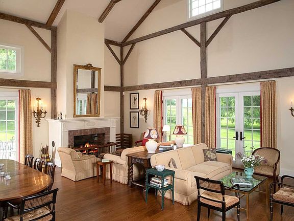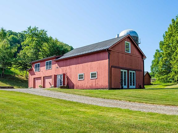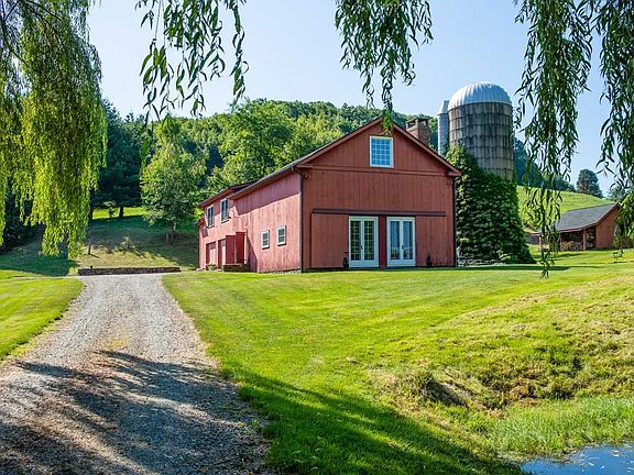 McGhee Hill Farm's 46 plus acres of sequestered beauty captures the soul of Dutchess County. Extensive lawn and wooded trail, a spring fed pond, old growth trees, and exquisite plantings make this a magical sanctuary. On the property are two charming live-in ready homes ideal for extended family, generational living, or entertaining. The original building is an 1890s farmhouse with 5 bedrooms, 3 baths, a large family-friendly living room and open dining-kitchen area facing west toward the Catskills. The view encompasses ever changing dramatic sunsets as captured by the Hudson River painters. A big red barn was recently renovated for state-of-the-art comfortable living with all modern features and design touches steeped in history. A great room with a 24-foot ceiling with windows and French doors across three exposures leads to a large stone terrace. This dramatic living and dining space features glowing wide board floors and a large Rumford fireplace. Open to the great room is a high-end kitchen with green stone countertops, professional grade Wolf stove and other top-of-the-line appliances. Off the entry is a handsome powder room. Upstairs there is a sitting room, 2 large bedrooms and two full baths. The double exposure corner master bedroom has built-in cabinets, a walk-in closet, and a window seat. The en suite bath includes double sinks, bathtub and a large walk-in shower. This home is replete with ingenious and extensive storage options, a laundry, and a remarkably preserved haymow, now used as a play or studio space, graced with antique fir floors and a soaring ceiling.