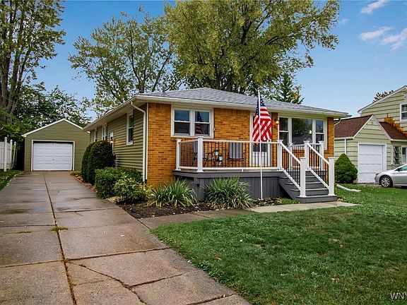 Charming ranch-style home in the highly sought-after Ken-Ton school district! Situated on a 45' x 112.5' lot in the Town of Tonawanda, this single-level residence offers 3 bedrooms, 2 full bathrooms, central air, and 1,118 sq. ft. of comfortable living space. The open, inviting layout includes a partially finished basement for extra living space or storage. Recent updates include a new furnace and central air system (2023), a composite front porch (2024), vinyl siding (2018), and a sump pump (2019). Outside, a 1.5-car detached garage and additional driveway space provide convenience and security. Located in a quiet, established neighborhood near schools, amenities, and transit—this move-in ready ranch home is a must-see!