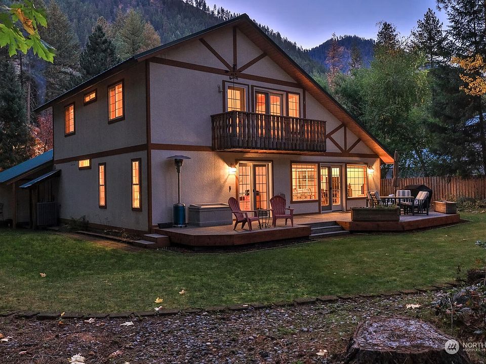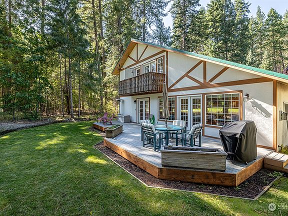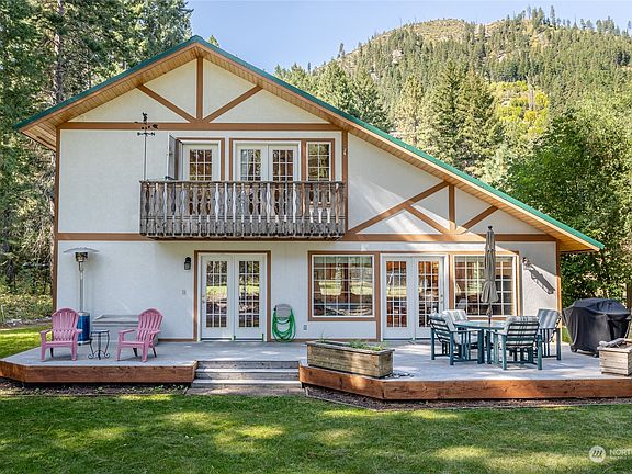 Immaculately maintained home of Icicle road, positioned on the 3rd hole of the Leavenworth Golf Course. This home offers 3 bedrooms, 2.5 bathrooms, gas fireplace, primary on the main floor with new primary bathroom with heated tile floor & tile shower, large walk-in closet and French doors to the outside deck. Spacious kitchen open to the dining & living room has custom cabinets with pull-out drawers. Open loft, 2 bedrooms upstairs, with access to decks overlooking the golf course. Large heated 2 car garage and golf cart storage . Easy to maintain yard with sprinkler system. Serene mountain & golf course views within walking distance of our Bavarian Village and Icicle River! New heat pump & hot water tank.