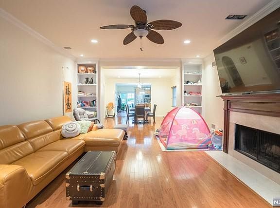 Enter into this luxurious custom built home, designed with open concept living in mind. Kitchen boasts upgraded custom cabinetry & appliances, lots of storage, large center island, granite countertops & ceramic tile floors. Large open dining and living space, plus gas fireplace. Primary suite with full bath and walk in closet, and 2 additional bedrooms with large closets. Glass siding doors in the kitchen lead to a private patio and a well manicured backyard. 2 car finished garage with it's own separate electric & full storage above & 5 car driveway. Laundry hook-ups in unit! Close to major highways, parks, and shopping; 1 block from NYC transit.