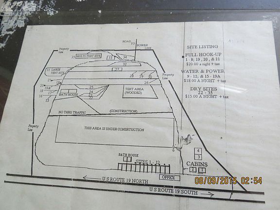 Working Campground with additional acreage that is undeveloped. Contains over 29 acres that border Route 19 North. Office with living quarters, storage sheds, 4 rental efficiency cabins. Water/Power/Sewer on 16 camp sites, Water & Power only on 8 sites. Numerous tent sites and several other site possibilities. This land would also be great for many different purposes. All Underground utilities
