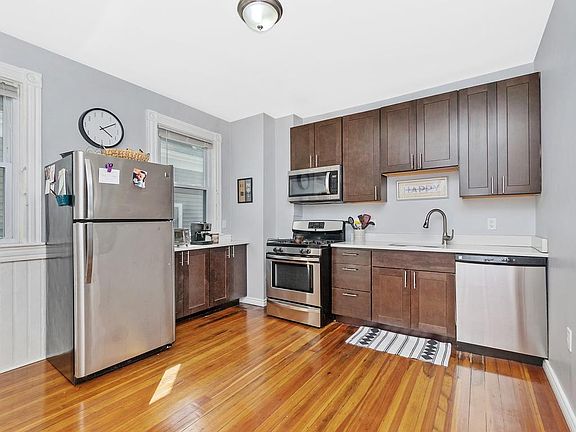 Sunny four-bedroom with hardwood floors, tall ceilings, and two full, modern bathrooms. This floor-though features four bedrooms, each with closet, an open layout with modern kitchen with quartz counters, stainless steel appliances and a breakfast bar, plus a wonderful sun lit dining room. Enjoy basement laundry, shared patio and ample storage in the unit and outside the unit. Avail Sept 1 (possibly August 1). No pets, no exceptions. No smoking