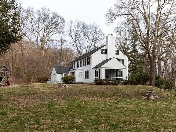 Waterbury's most beautiful lot and location! This stately custom-built antique colonial is situated at the end of a quiet cul-de-sac in the Country Club neighborhood of The Ridges and is flanked by historic rock walls and is just minutes from I-84 and Route 8. The enormous entryway with antique door is reached on a herringbone brick walkway. Beautiful hardwood flooring, soaring staircase with dental molding and carved banister grace the oversized foyer. The traditional colonial floorplan features a large family room with woodburning fireplace, custom built-in shelving and wood cornices above the windows. A lovely antique glass door opens to a three-season porch with flagstone flooring and wide windows, perfect for watching the sunset and sharing a meal with family. The formal dining room on the main floor is exquisite, with handcrafted woodwork and trim that should not be overlooked. The spacious kitchen with original wet bar nook leaves plenty of room for a table. A half bath and wood paneled den with built-in shelving and huge windows complete the main floor. The master bedroom on the second story has hardwood floors, custom closets, & full bath. Three additional large bedrooms share a second full bath upstairs. The partially finished walk-up attic is ideal for a playroom or home office. This home, built in 1953, had safety in mind with a bomb shelter in the basement which could double as a wine room. The two car attached garage leaves ample space for lawn equipment.