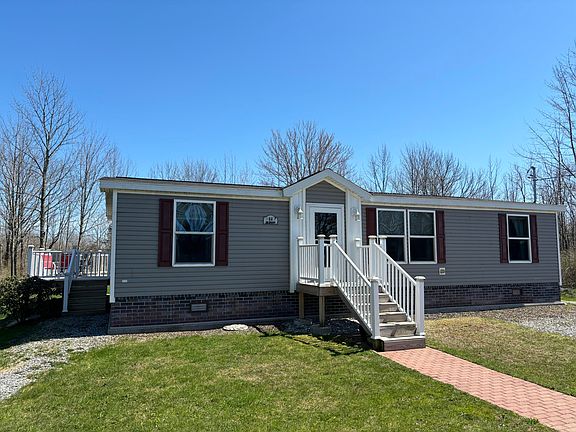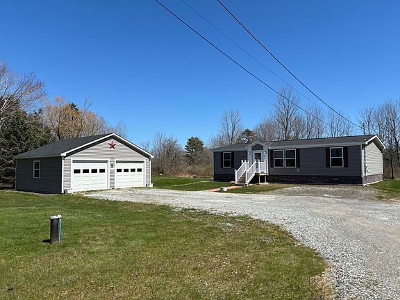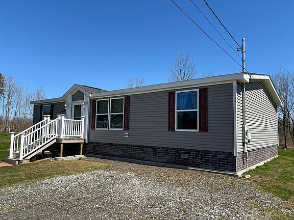 Excellent doublewide manufactured home (44 feet by 26 feet, 8 inches) with stick built two car detached garage.  New stainless kitchen appliances recently added.  New carpeting recently installed.  Kitchen includes center island with two bar stools.  Dining area with sliders to large deck in back.  Master bedroom includes wall mounted television.  Two window AC units are included.  New electric hot water tank in 2024.  Upgraded insulated skirting installed.  Detached garage includes two electric door openers.  New roof on garage in 2024.  Home is manufactured by Commodore Homes of Clarion, Pennsylvania (serial number:  CP54223AB).  Home is an 2017 'Energy Star' qualified home.