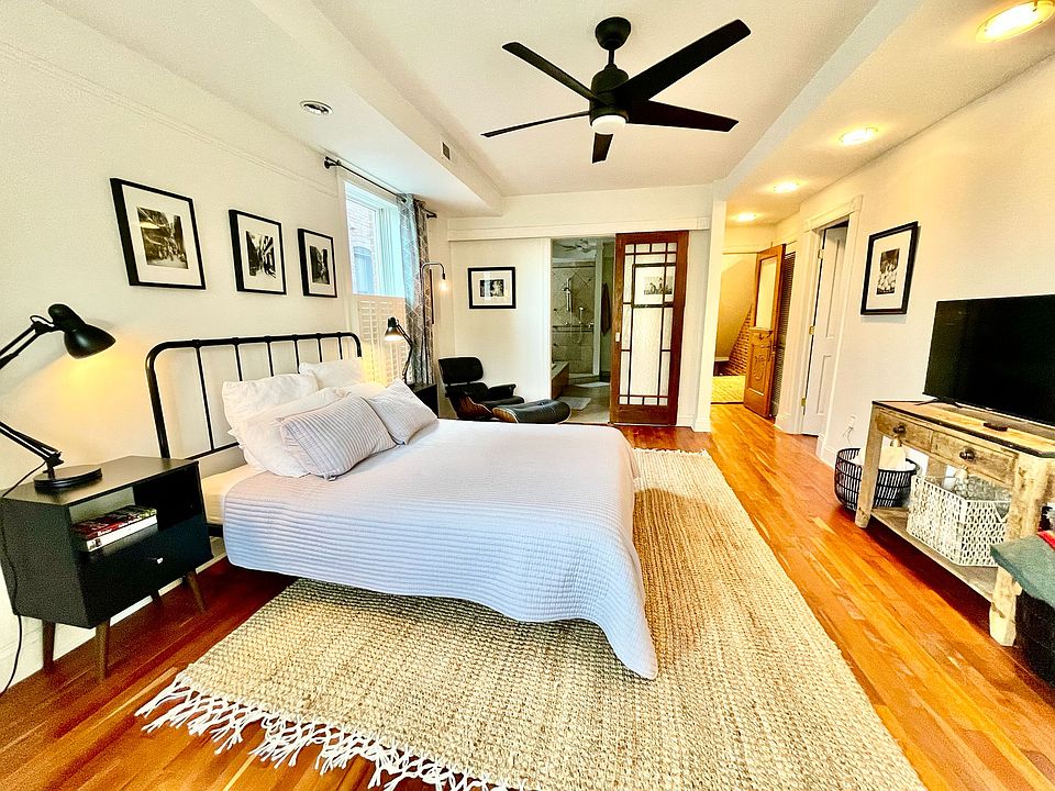 We live in a warm and thoughtfully maintained historic row house in Washington, D.C. a space that friends and family often describe as one of the most beautiful homes they've visited. It's not your average rental; it's a well loved home, and we're looking to share it with a respectful individual with good vibes. As a couple in our early 40s, we'll be traveling frequently between Europe and D.C. from September through March 2026. During this time, we're offering a spacious, private room for rent on its own floor, providing comfort and plenty of privacy. **Master Suite (Second Floor - Black bed frame and jute rug in photos)** This large, sunny master suite has two closets (one walk-in) and a spacious en-suite bathroom with a jacuzzi tub and separate shower. The room also includes a desk, chair, and TV. Large south-facing windows provide plenty of natural light, with both curtains and blinds for privacy. Rent: $1,800/month + 25% of utilities (~ $100-150 /month) **Shared Spaces** Movie & Lounge Room (Second Floor): This cozy space is outfitted with a large TV, a single day bed, a desk, and (we're biased) but the best jungle wall paper. When we're not in town (most of the lease term), you will have access to this room. When we're in town, we will use it as an office. Study & Balcony (Third Floor): This room features bookshelves and a desk, perfect for work or quiet time. It connects to a top-floor balcony with beautiful views of Crispus Attucks Park. The balcony includes lights, built-in speakers, and is available for use. When we're in town, we will use the spare bed in this room. Kitchen, Dinning Room, and Living Room (First Floor): The kitchen is fully equipped with an island, two ovens, a gas cooktop, dishwasher, refrigerator, microwave, and plenty of cooking gadgets (air fryer, Instant Pot, blender, etc.). You'll also find full dishware, flatware, and wine glasses. The kitchen opens up to a sunroom, large living room, and dining room all tastefully decorated and perfect for relaxing or spending time with others. Backyard: The house has a generous backyard space that backs into Crispus Attucks Park. Lease terms are 3 month or 6 month with possible option to extend.