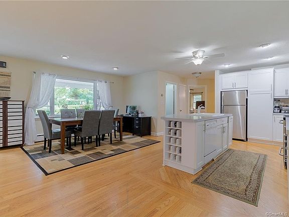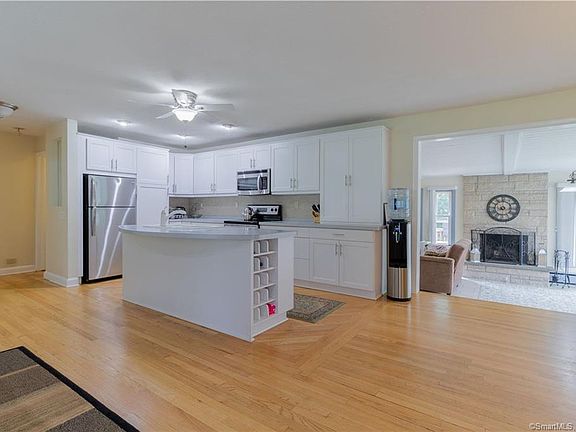 Spacious, updated, easy living in this comfortable ranch home! Wonderfully located in a quiet neighborhood, this level property welcomes you into the home with a covered front porch for a sweet sitting area. The spacious 1617sf open floorplan offers flexible space for the living & dining room, remodeled kitchen with island, stainless appliances. The bonus is the large family room with 2nd fireplace with granite floor to ceiling, raised hearth. This bright area offers wonderful windows and door to oversized deck. Finished lower level offers 4th bed & playroom- +/-500sf. The beautiful yard is perfect for play, grilling, entertaining. Cheshire has so much to offer-Farmington Linear Trail just down the street, town pool, vibrant Park & Rec and YMCA programs with adult education. Top-rated schools, convenient crossroads of CT for travel to Hartford, New Haven, NYC, Boston, Yale, Quinnipiac, hospitals. Endless cultural experiences in the area. Enjoy this lovely area & town! Seller is replacing all windows throughout and reconfiguring the back room's new windows as well.