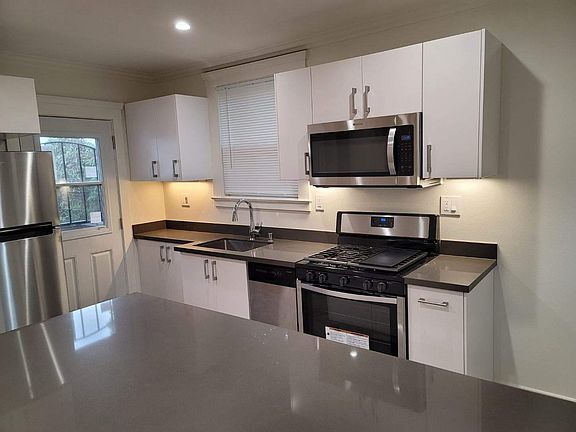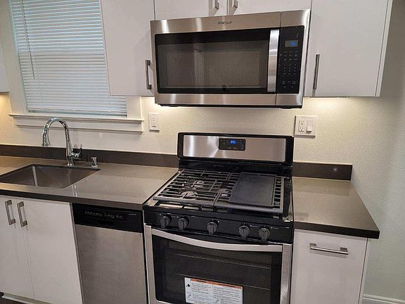 Welcome to 840 47th St., a small 4-plex in North Oakland on the Emeryville border. The interior of this newly remodeled 2-bedroom 1-bathroom top floor unit, showcases an abundance of luxury features you won't want to live without. The amazing chef style kitchen includes new quartz counter tops over brand-new white soft-close cabinets, a stainless-steel sink with a high-quality sprayer faucet, a powerful garbage disposal, under counter LED lighting and a large island. Kitchen is equipped with a high-quality stainless-steel appliance package including a refrigerator, a five burner, heavy grated gas range with a built-in microwave above, and a tall-tub ultra-quiet dishwasher. This unit features tiled bathroom floors and walls with a new vanity, basin, and fixtures. Real hardwood flooring throughout, with oversized custom baseboards and crown moldings complementing the detailed trim work applied around the abundance of double-pane windows and doors. Energy efficient lighting plus tons of natural light, large bedroom closets and a hallway linen closet. All ceiling fans and the 50" in-wall fireplace are remote controlled. A high quality, full-sized, front loading, stackable washer/dryer by LG provides a convenient in-unit laundry. Off-street parking and on-site mixed recycling are available for use. Water, garbage, and parking included. Please call to set up a time to view the unit. Water, garbage and parking included. A full month's rent is due at move-in, prorated amount to be paid the following month. No smoking, no pets.