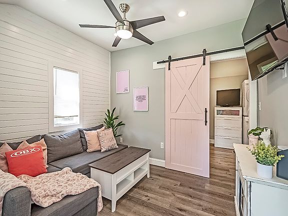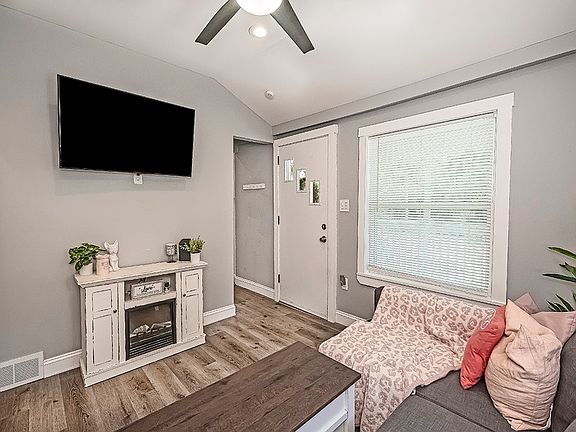 Adorable Bungalow! This tiny house is move in ready! Fully renovated in 2020 with New Roof, Siding, Furnace, AC, Hot Water Tank, Concrete Parking Pad for two cars, Electrical, Plumbing, Windows, Rear Porch, and more! The house sits back from the road. The Covered Front Porch is welcoming and will allow you to enjoy lots of evenings outside. Step into the Cozy Living Room with Shiplap Walls, Vaulted Ceilings & an abundance of Natural Light, barn doors lead the Master Bedroom which also boasts vaulted ceilings, and an equipped laundry area with full sized stackable washer & dryer, Stylish Full Bath with Ceramic Tile Shower. Between the bedroom & bath is a mudroom & door to back deck & yard. The Kitchen with a built in table is designed for a Home Chef & features Stainless Steel Appliances & plenty of counter space. The backyard abuts an alley way. The Full basement features interior french drains and glass block windows. Basement could be finished to add Square Footage.Welcome Home!