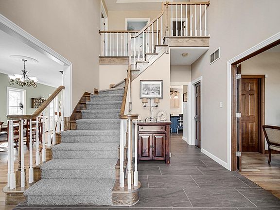 Nestled in Hunters Ridge Estates, 4 bedrooms, 4.5 bathrooms, 2 kitchens, and a walk out basement. Upon entry, you are greeted by a two-story entry way with brand new porcelain floors. Brand new oak flooring in the dining room, office, and living space. A gorgeous, open concept kitchen equipped with quartz counter tops, an island, stainless steel appliances, and a breakfast area that walks out onto the lovely back yard deck. A stunning living room with a cathedral ceiling, fireplace, wet bar, and opens to the deck. On the upper level are your four nice size bedrooms all with access to an ensuite bathroom. In the daylight basement is an additional open concept kitchen with stainless steel appliances where you can walk out onto your backyard patio or enjoy the weather from inside by the fireplace! Also, a gym, flex room, and a full-size bathroom. A home warranty will be provided. This home has so much to offer. Schedule your showing today and let's make this house your home!