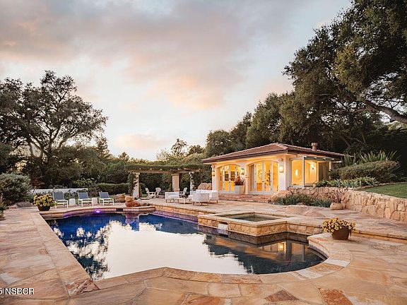 Nestled within the serene embrace of Riven Rock enclave, this 4-bedroom, 2.5-bathroom estate with a detached guest/pool house with a full bathroom -- totaling 4-bedrooms, 3.5-bathrooms -- offers the ultimate retreat for those who value both sophistication and seclusion. Behind mature oak groves and thoughtfully designed privacy gardens, this extraordinary mountain view estate represents a labor of love -- thoughtfully updated by the current owners. From the moment you arrive via the newly stamped concrete driveway, flanked by elegant stone columns and walls, you'll appreciate the seamless blend of architectural integrity and modern luxury that defines this remarkable property.You will be greeted by Brian McNally's breathtaking commissioned stained glass installation, ''Ivy Lane at Riven Rock'' - an 18-foot tower of light that transforms your daily homecoming into a moment of wonder. Step through the new double front doors and into the living area with sweeping views of the pool and park-like grounds, along with a fully refurbished barbecue area with new wall tile.The heart of your home -- a stunning gourmet kitchen -- showcases Viking appliances, including a gas stove, microwave, and wine refrigerator that work alongside a Miele dishwasher, all complemented by gleaming quartzite countertops, custom copper sink and faucets, and beautifully refreshed cabinetry with copper hardware. Enjoy the warmth of the sun in the glass breakfast room while overlooking your private English garden, where botanical treasures create an ever-changing tapestry of color and texture.