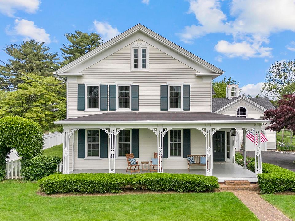 This charming home is minutes from shops, restaurants, beaches and recreation. Enter this level property via a circular, gated driveway with beautiful flowering plants and trees. Step inside to sun-filled rooms, enhanced with gorgeous wide, pine wood floors. The main level boasts over 9-foot ceilings, stately fireplaces and well-placed French Doors that create exquisite living spaces. The kitchen sparkles with light from walls of windows, glass door cabinetry and views of the 2.5 acre protected Open Space filled with birds and butterflies. Many can gather in the eat-in kitchen or flow to the patio and deck to enjoy outdoor dining, star gazing or entertaining in the spacious, private yard. Unwind at the end of the day in the expansive primary suite with a soaking tub, cathedral ceilings and serene garden views. Or retreat to the expansive family room overlooking the meadow and organic garden for relaxing, playing and exercising. Its vaulted ceiling rises past the ceiling fan to a stunning, lit Cupola. A/C throughout, including top floor of main house where there's an extra large room with built-ins and closets. This lovingly updated home also provides remote offices, au pair options, and the ability to add a pool and a pool house. It's only minutes to walk to the elementary school, and property has a fenced yard for families and pets. Over 50 brand new Thermal Windows, all new Gutters, Leaders, Security/Fire system, Furnace Flue, Appliances, Lighting; Painting and more.
