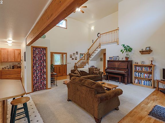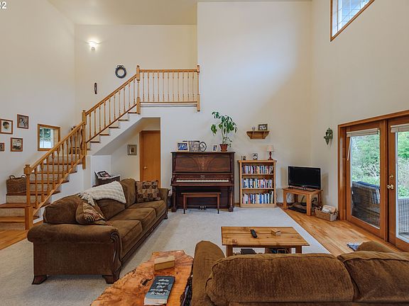 Custom built home in somewhat private location. Interior nice and bright. Open floor plan with high ceiling. Oak flooring in dining area, and living room perimeter. Myrtlewood steps to a dedicated second floor master suite with private covered deck. Covered porch expands complete width of front entrance. French doors off living room to covered deck to back yard with a fire pit. Office on main floor could be used as a third bedroom. Detached two car garage with opener.Architectural composite roof