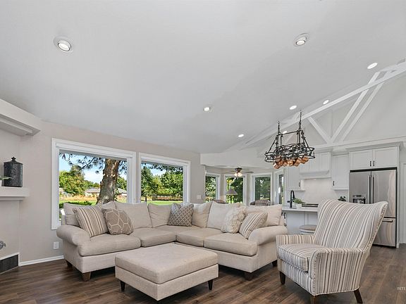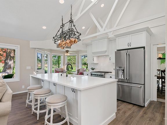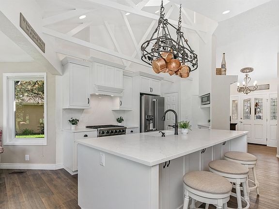 Nestled among the rolling greens of Eagle Hills Golf Course, this home is a serene oasis of tranquility and sophistication with classic architecture, abundant natural light, and bright atmosphere. The open main living area provides gas fireplace, neutral fresh paint colors, and large windows allowing abundance light and uninterrupted views of the verdant fairways. The recently updated farmhouse-style kitchen boasts quartz countertops, large center island, and charming breakfast nook. Well thought-out open floor plan connects formal dining area to front living room for entertaining. Primary bedroom suite is a sanctuary of relaxation with deep soaking jetted tub, premium tiled shower, and walk-in closet. The backyard features a private patio offering a delightful spot for enjoyment and views of evergreen golf course. Harmonious blend of classic style, comfort, and the natural beauty of the surroundings.
