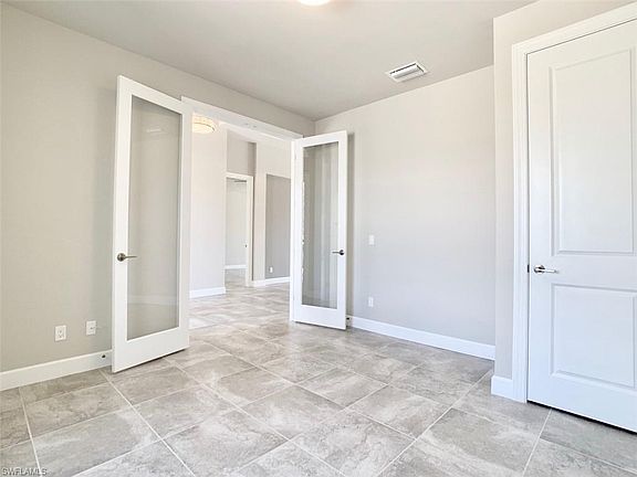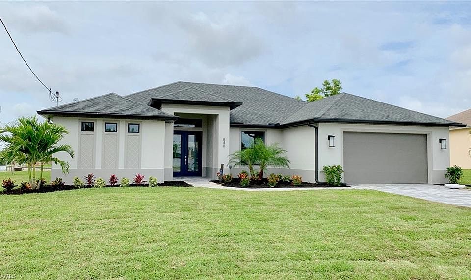 NEW CONSTRUCTION - Completion in May. Open concept 3 Bedroom plus Den Pool home with highly sought after Southern rear exposure on an intersecting canal! Porcelain tile flooring throughout home. 8' Doors. Split bedrooms floor plan offers privacy. Kitchen/Great Room with 11' ceilings. Double tray ceiling in Great Room. Kitchen includes 42" tall cabinets with dovetail drawers and soft close doors, large island with space for seating, granite countertops, tile backsplash and stainless-steel appliances package. Master bedroom with tray ceiling and sliding glass doors that open to lanai. Master bath with separate vanities and dual showers with niches. Pool with pavers and screen enclosure. Summer kitchen rough-in. Designer lighting package. Granite countertops in all baths. Garage with storage/workshop area and epoxy coated floor. Paver driveway. Floritam sod with irrigation system. Not in a flood zone, save on insurance!