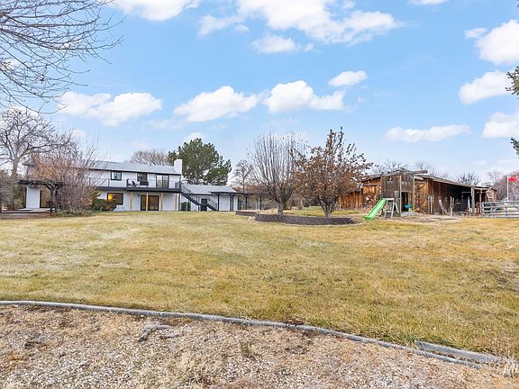 Country living at its finest! This ENORMOUS Farmhouse was recently updated from head to toe with exceptional finishes. The main entrance has a jaw-dropping spiral staircase carefully designed with beautiful custom rod-iron handrails. The family room boasts a fantastic fireplace with a perfectly finished custom mantle. The kitchen is wrapped eloquently with quartz counters, a built-in range, a double oven, and a free-standing range hood over the custom island. Travel upstairs to the master suite with a perfectly designed walk-in closet, a stand-alone tub, and a walk-in shower, all brought together with the fully tiled floor. Enjoy the gorgeous views off the deck out into your over an acre and half property that overlooks the Treasure Valley. Bring your horses to move into the 3 stall barn, but don't forget to enjoy your personal sauna downstairs!