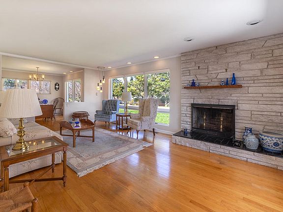 Traditional ranch with a Mid-Century flare and spacious light filed rooms boast a formal living room with quartz stone fireplace, dining room, kitchen with sunny eat-in area , 3-4 bedrooms and 2 full baths on main level. Hardwood floors through out, carpet in the master bedroom. The basement with a interior/exterior access offers a large family room with Terazzo floors and stone fireplace, 1 bedroom ,kitchen and full bath creates a great opportunity for hosting family or a separate apartment for in-laws. Two car garage attaches to a 21x21 enclosed courtyard that offers privacy for your outdoor lounging. This meticulously maintained home sits on .80 ac on a well landscaped corner lot.