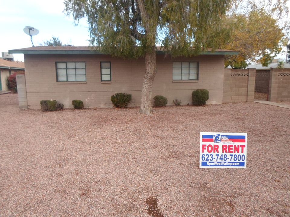 Clean and cozy 2 bedroom 1 bath unit. All tile for easy upkeep. Neutral paint, ceiling fans and window coverings throughout. Kitchen offers white fridge and gas stove. Tiled bathroom with tub. Private shared front yard and covered patio area by front door. Parking in the back of complex. Pet friendly with deposit. 1 MONTH FREE RENT! Call today to schedule a tour! (623)748-7800 x 107
