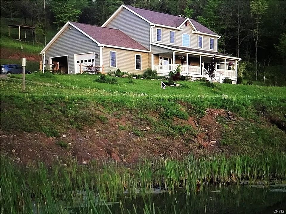 Enjoy the pleasures of rural living on this sprawling 22.5 acre estate with with all of its modern amenities: indoor fireplace, cathedral ceiling, and open floor plan. Stunning views encompass this beautifully set home on all sides. Mature fruit trees landscape the property. An animal and nature lovers' dream that includes a fully functioning horse barn and chicken coop with fresh, city water on a 9 acre pasture that's surrounded with high tensile fencing. Garden in the 50x25 separately fenced area or take a walk through the woods to sit by one of the two ponds. Enjoy a bonfire out back or relax on the picturesque, covered front porch watching the evening sunset. Ideally positioned to enjoy the serenity and privacy the country offers yet ten minutes from the thruway and surrounding towns.