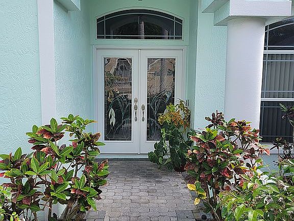 From the living room, three nesting sliding glass doors lead into the 200 sq ft carpeted Florida room. The room’s many tinted and screened windows can be opened to catch cool cross breezes. From the Florida room, access the large completely fenced back yard. Its half-moon bricked patio is shaded by trees and an expansive sun sail that will convey with the home. Mature landscaping is accented by Queen palm and plumeria trees, two giant white bird of paradise, a magnolia tree, producing longan fruit and grapefruit trees, pineapple plants and foliage native to Florida. The property sits at the end of a cul de sac in a peaceful residential neighborhood of Sunset Lakes.